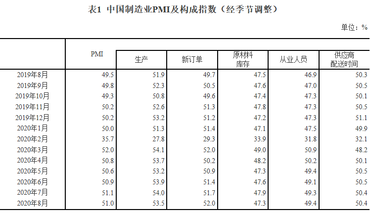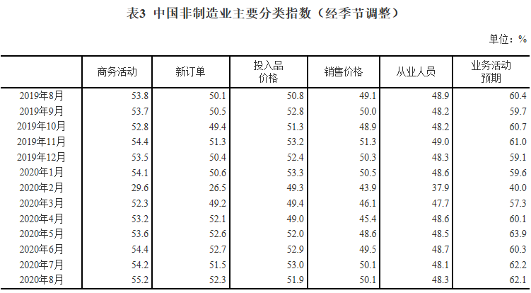 附:2020年8月中国采购经理指数运行情况