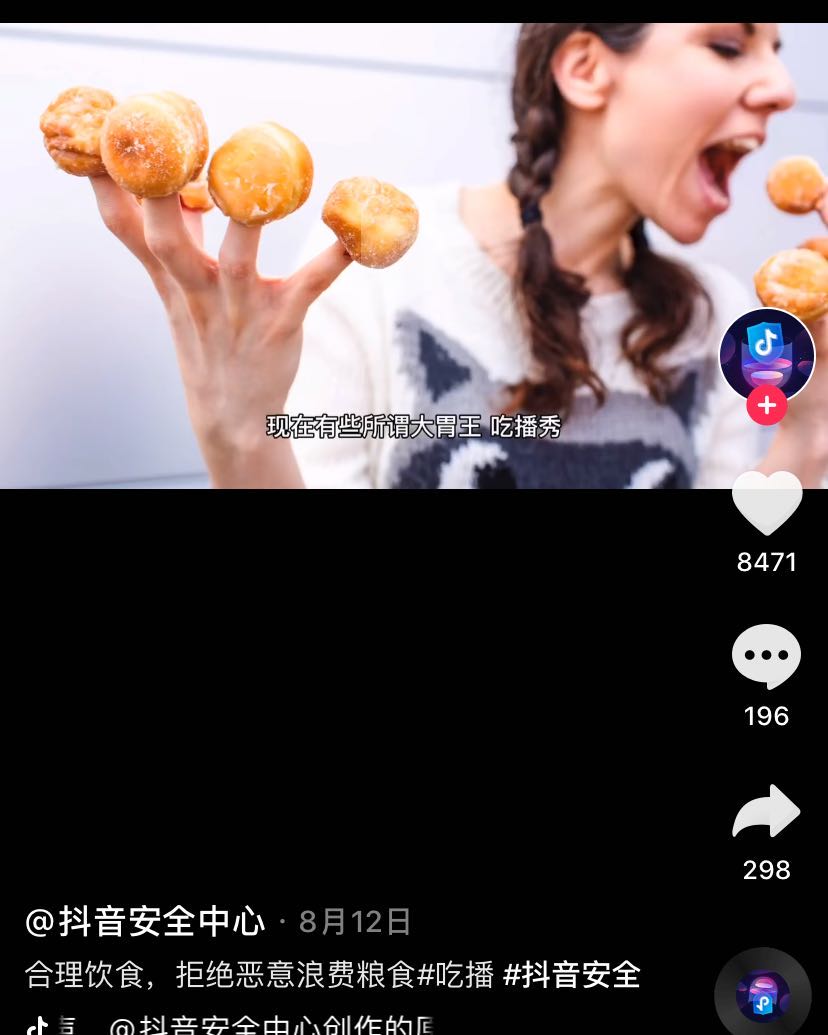 此前,斗鱼、快手、抖音等多家平台表示加强对美食类内容的审核。在快手中搜索“吃播”时会看到“爱惜粮食,合理饮食”的提示字样;在抖音中搜索“吃播”不仅展示了“珍惜粮食,拒绝浪费,合理饮食,健康生活”的提示语,与“吃播”相关的话题也被清空。