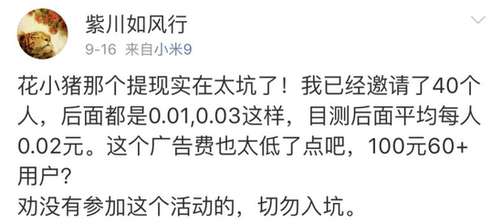 然而,此类营销很快遭遇质疑。“我觉得这个活动是一个陷阱。”山东消费者张女士向《中国消费者报》反映了她的遭遇。刚开始参加活动,马上就被告知“获得”了近90元的现金,但她按照规则连续多天参加活动,“拉”了 几十位朋友成为了花小猪APP的新用户,但“获得”98.9元现金后,再向帮花小猪”拉“新用户,账户现金就不再增加了。