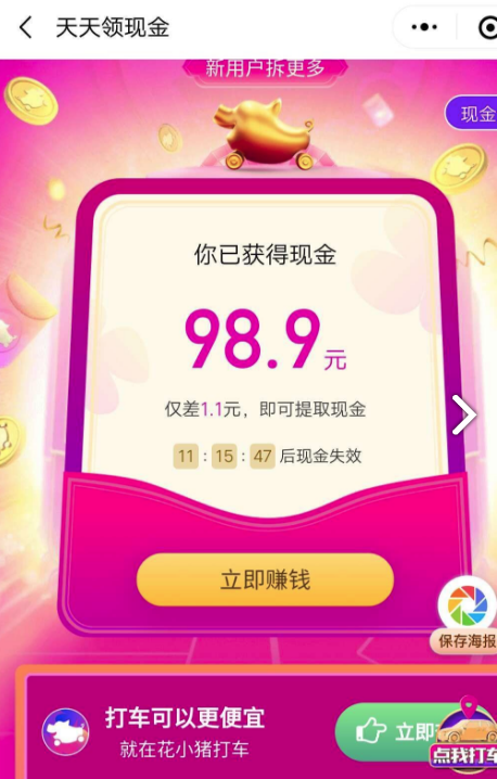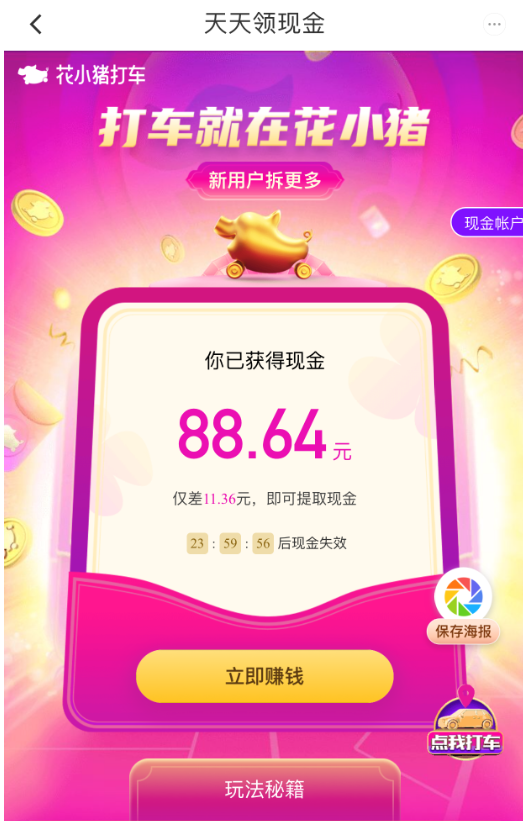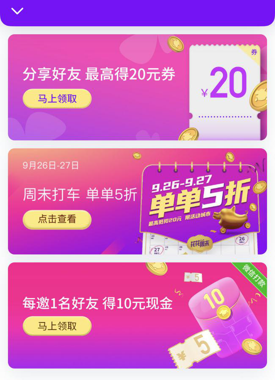 9月25日,记者注册“花小猪”APP进行了体验,登录后发现“天天领现金”活动已经结束,但类似的邀好友得现金或优惠券活动仍在继续。