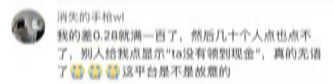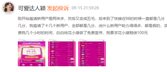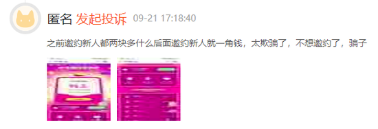 在黑猫投诉平台,也有不少消费者投诉同样的情况。“刚开始邀请新用户是两元多,然后又变成五角,后来到了快接近98元的时候一直都是几分。”
