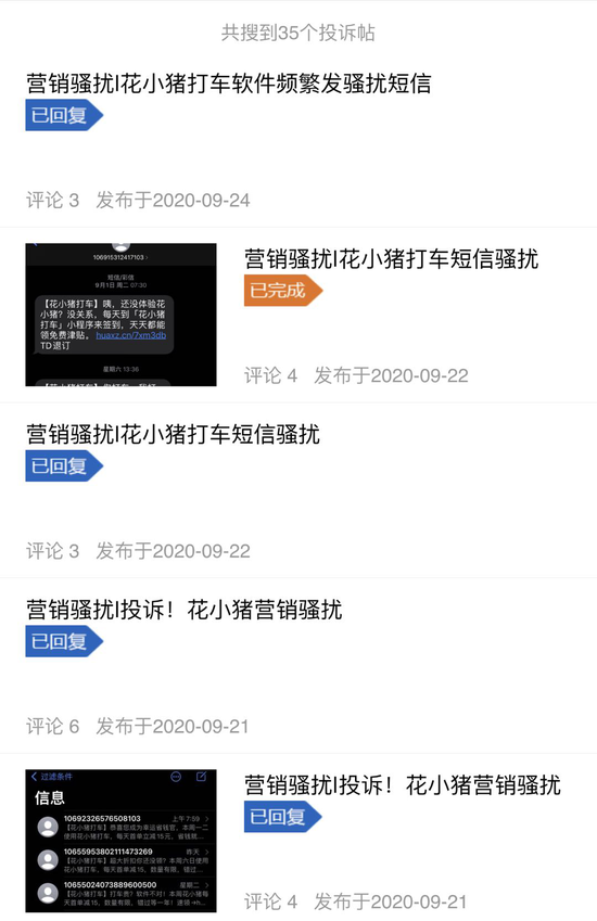9月25日,在聚投诉平台,记者看到投诉花小猪“营销骚扰”的帖子有35条。