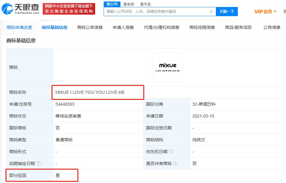 据天眼查APP显示,近期,蜜雪冰城股份有限公司申请注册的“MIXUE I LOVE YOU YOU LOVE ME”商标被驳回,国际分类涉及啤酒饮料、广告销售。