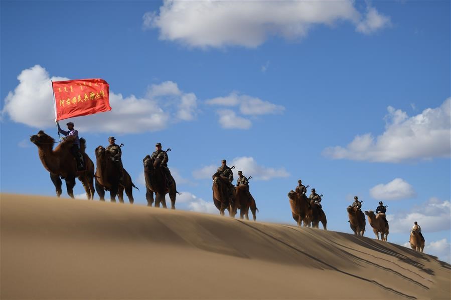 10月15日,阿拉善右旗边防民兵驼兵排民兵进行骆驼应用训练。