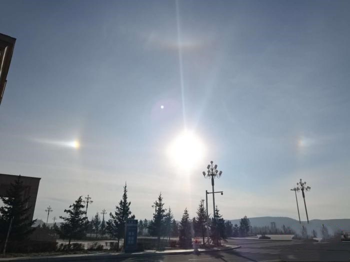 记者19日从内蒙古自治区呼伦贝尔市气象局获悉,当日清晨,内蒙古呼伦贝尔市根河市和牙克石市两地同时出现“幻日”和“环天顶弧”奇观。