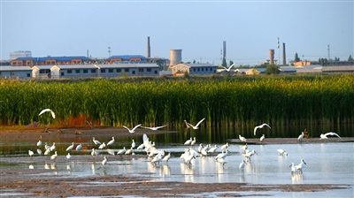 9月24日,内蒙古巴彦淖尔市磴口县森林公安局民警在澄清湖发现了数百只国家二级重点保护动物白琵鹭,正在悠闲地觅食、嬉戏,在清澈的湖水映衬下,显得十分安逸。