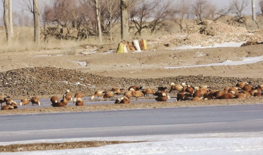 近日,在杭锦旗杭锦淖尔自然保护区水域,一望无垠的水面上,近万只赤麻鸭正在集群觅食。