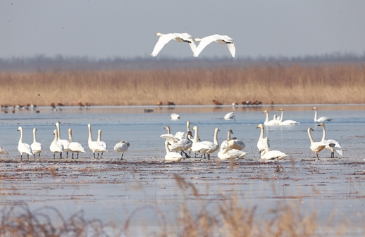 每年2月中下旬,经过长途迁徙的天鹅,都会在包头黄河湿地短暂停留,补充食物,恢复体力。它们聚集在恬静的水面上,戏水觅食,画面和谐温馨。