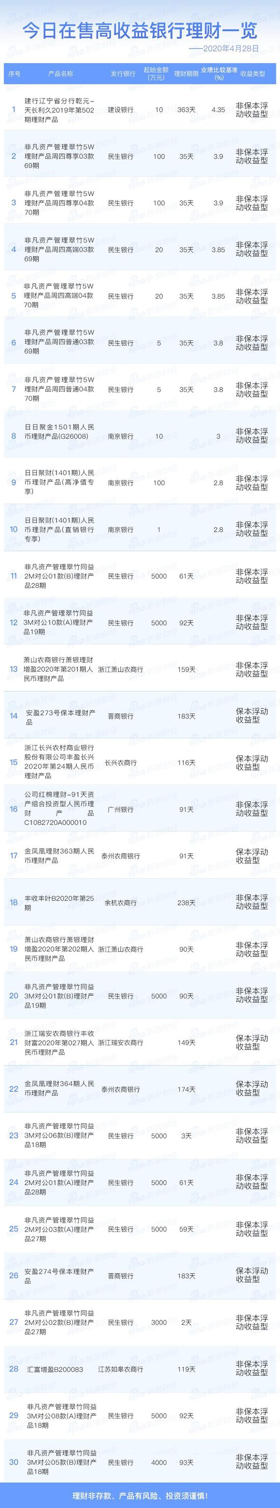 4月28日在售高收益银行理财产品一览