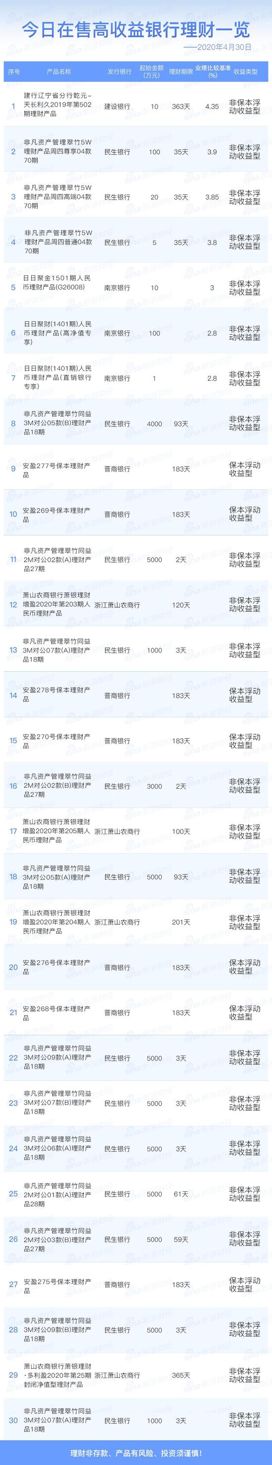 4月30日在售高收益银行理财产品一览