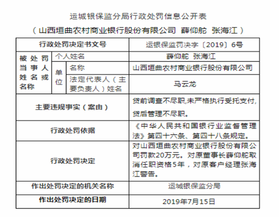 值得注意的是,2019年7月23日,运城银保监分局发布行政处罚信息,因存在贷前调查不尽职、未严格执行受托支付、贷后管理不尽职的行为,对垣曲农商行罚款20万元,对原董事长薛仰舵取消任职资格5年,对原客户经理张海江警告。此外,今年1月16日,运城银保监分局再次披露对垣曲农商行的行政处罚信息,因违规超比例贷款被罚款25万元。