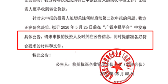 今天十六时许,杭州杭深再次发布公告,称正紧锣密鼓开展材料审核工作,请投资人耐心等待审核结果,并提示了需要补充材料的材料内容。值得注意的是,公告中表示 ,杭州杭深正在研究决策何时启动第二次申报,并请未申报的投资人提前准备好符合要求的材料和文件。