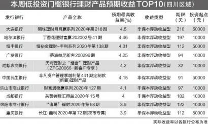 据不完全统计,本周面向西南地区销售的20款中高门槛银行理财产品中,最高预期收益率为4.4%。