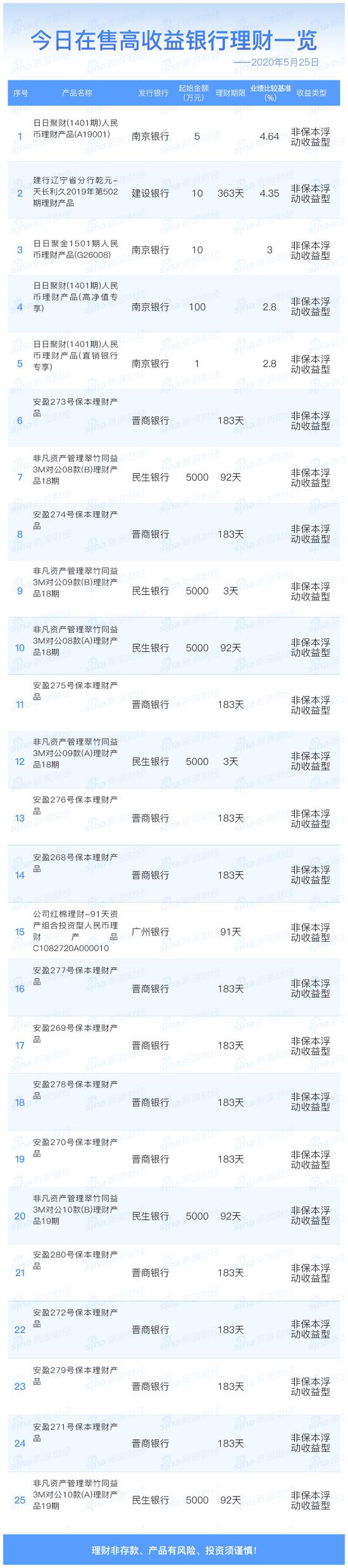 5月25日在售高收益银行理财产品