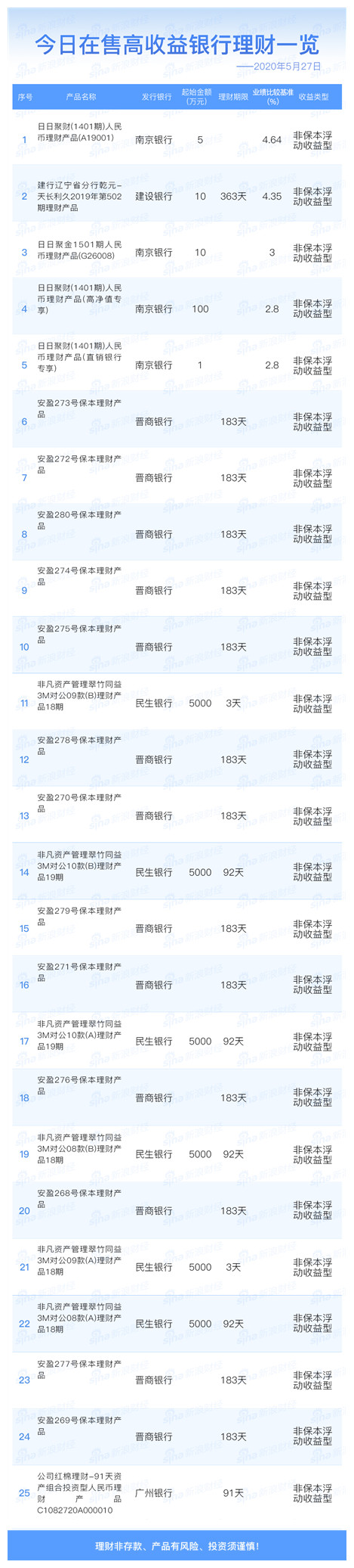 5月27日在售高收益银行理财产品:今日业绩比较基准在4.6%以上的银行人民币理财产品共1款。南京银行的“日日聚财(1401期)人民币理财产品”业绩比较基准最高,为4.64%。
