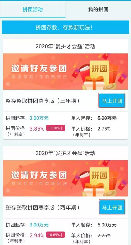不仅是贷款,银行在存款、理财上同样兴起了“拼团潮”。例如,某国有大行推出的拼团存款,手机银行用户选择产品后,将生成的链接发送给好友,邀请参与拼团,3人即可成团。其中“整存整取拼团尊享版”显示,3万起存,3年期年利率3.85%,2年期年利率2.94%。