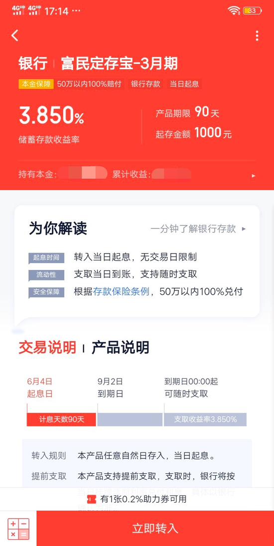 以富民银行的一款整存整取定期存款为例,“富民定存宝-3月期”在今年2月份时年化收益率为4.5%,如今同样的产品利率已下调至3.85%。