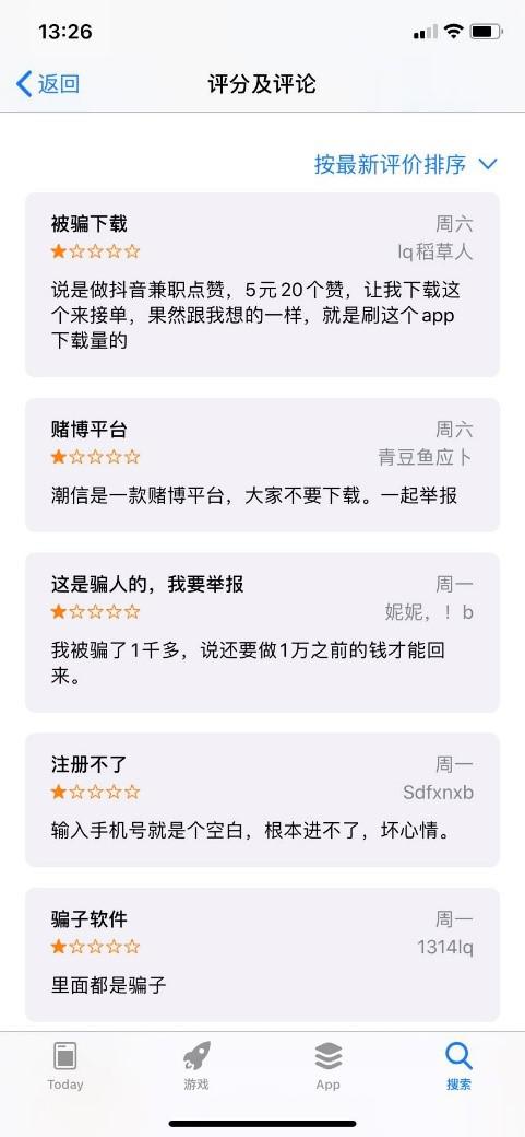 在潮信App iOS版最近2个多月的评论中,五十多名用户留言称,遭遇到刷单骗局。用“潮信”为关键词搜索知乎、百度等网站,会出现不少用户反馈遭遇了刷单骗局。