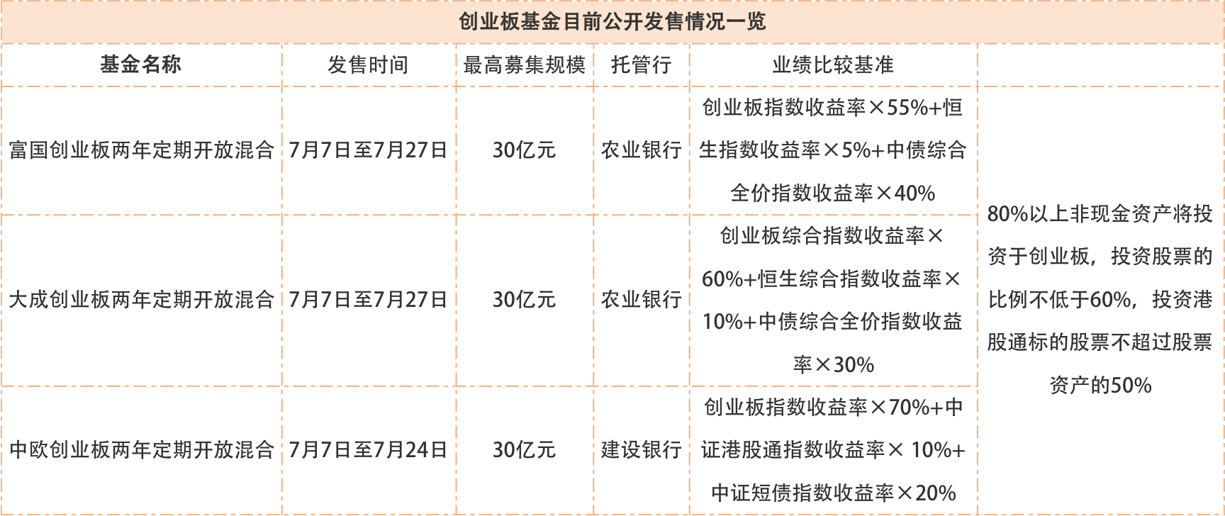 从基金份额发售公告来看,3只创业板公募基金均于7月7日开售。其中,富国创业板两年定期开放混合、大成创业板两年定期开放混合募集期限为7月7日~7月27日,中欧创业板两年定期开放混合定档发售期限为7月7日~7月24日。