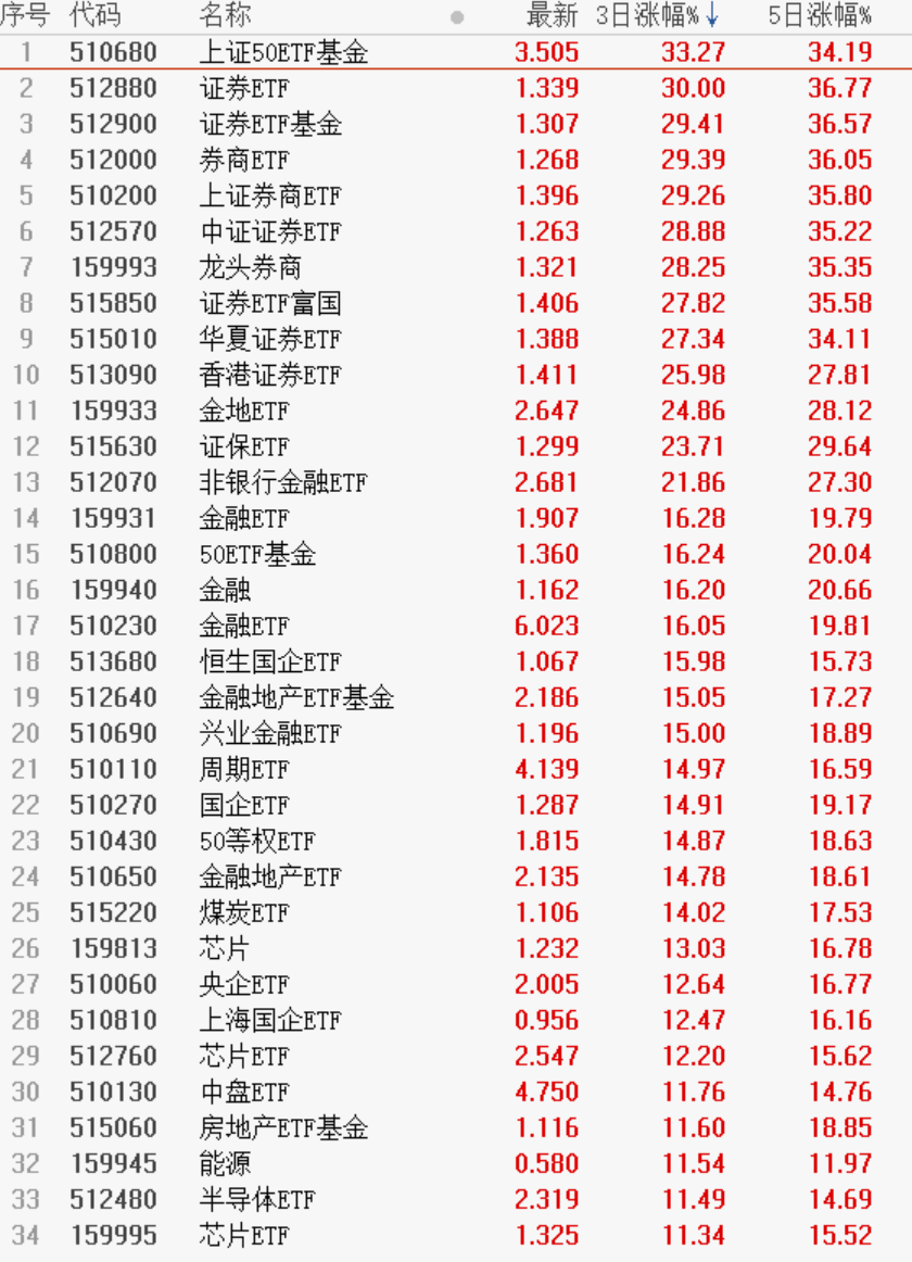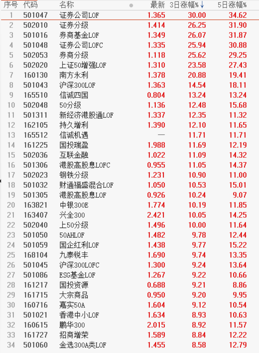Choice数据显示,截至7月6日午间收盘,近3日,ETF、LOF涨幅最高均超过30%,上证50、证券等指数ETF领涨。近5日看,甚至有3只券商行业ETF涨幅超过36%。