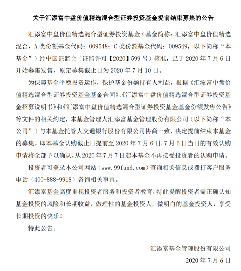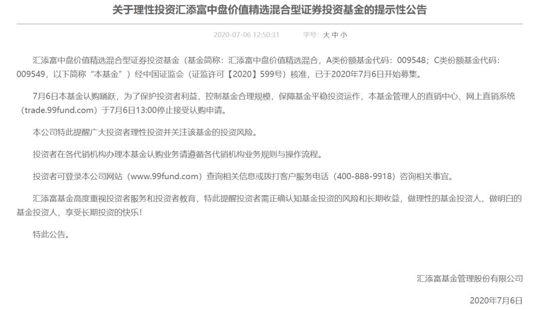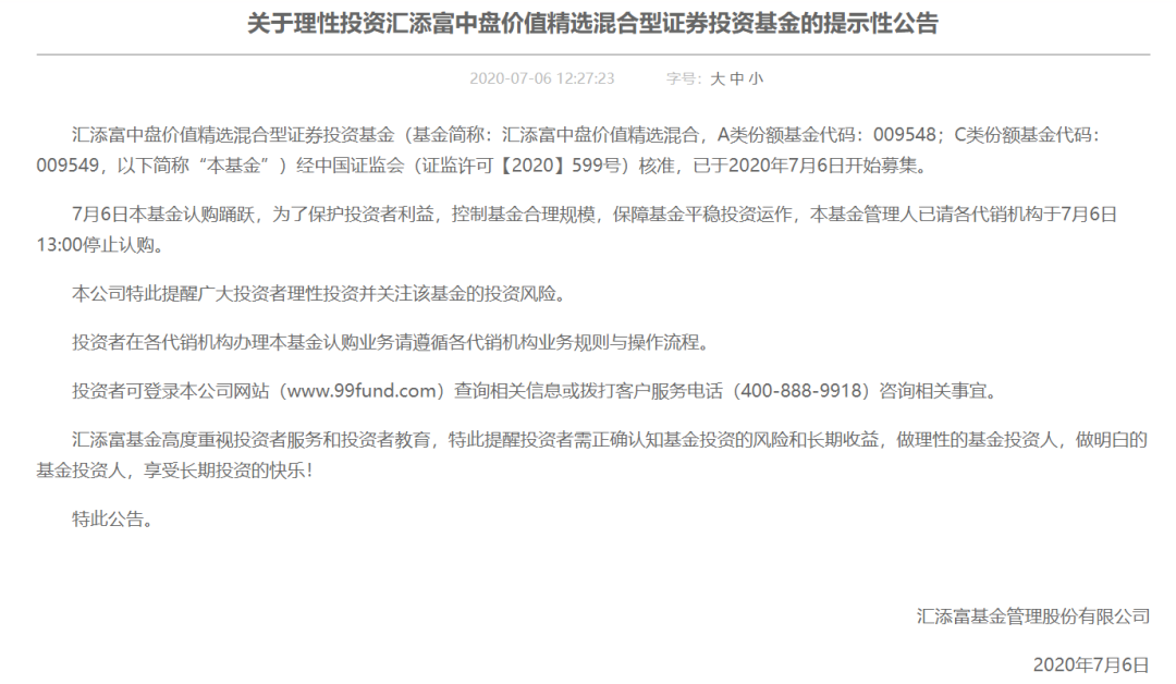 此后不久,汇添富发布2份公告。公告显示,基金管理人的直销中心、网上直销系统于7月6日13:00停止接受认购申请。同时,基金管理人已请各代销机构于7月6日13:00停止认购。