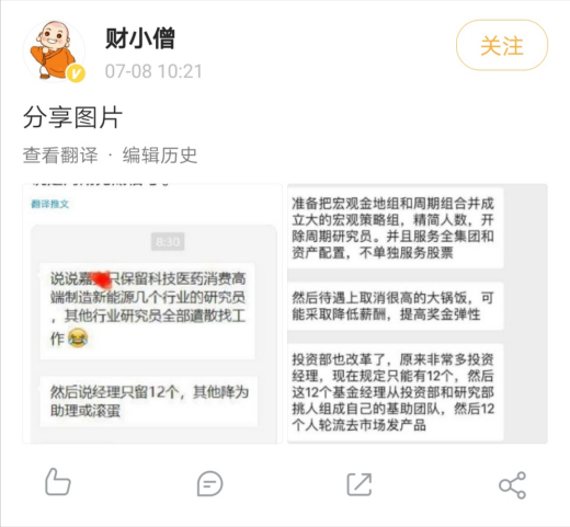 7月8日,网上有传言称,嘉实基金将只保留科技、医药、消费、高端制造、新能源等几个行业的研究员,其他行业研究员全部遣散找工作;准备把宏观策略组精简人数,开除周期研究员,并且服务于全集团和资产配置,不单独服务股票;基金经理只留12位,其他降为助理或解聘;这12个基金经理从投资部和研究部挑人组成自己的基助团队,然后12个人轮流去市场发产品;待遇上取消很高的大锅饭,可能采取降低薪酬,提高奖金弹性。
