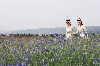 身着蒙古族服饰的姑娘尽享花海乐趣