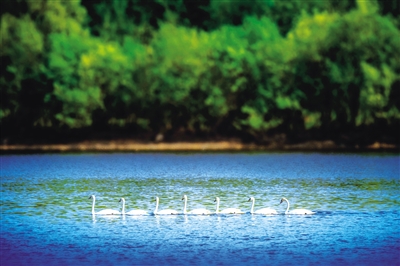 内蒙古大兴安岭保存完整的生态系统,为保护生物多样性提供了基础。图为一群大天鹅迁徙途中落脚大兴安岭天然湖泊
