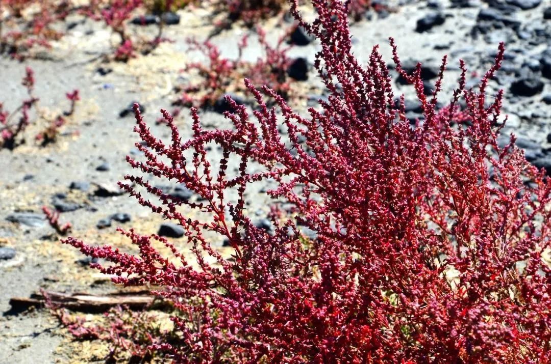 碱蓬草就像被称作为“沙漠之舟”的骆驼一样有着顽强的生命力。它不用人工撒种,也无需人工耕耘,一簇簇,一蓬蓬,年复一年地在光阴的荏苒中,酿造出一片片火红的生命色泽,成就了一个令人始料不及的奇特景观。