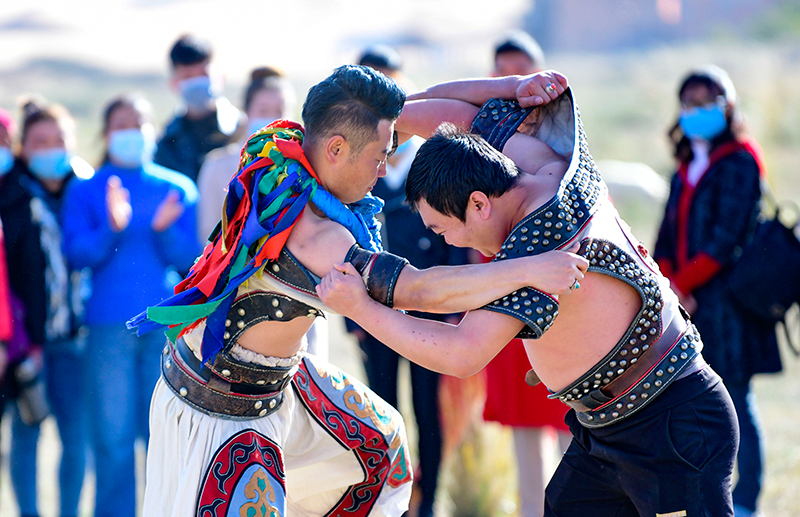 10月21日,一名游客(右)在阿拉善通湖草原旅游区民俗旅游项目中体验搏克