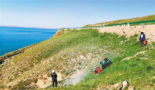 生态管护员在鄂陵湖边清理垃圾