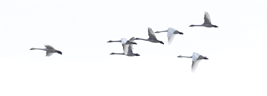 “10月6、7日,候鸟就开始陆续通过包头,大概10日左右,黄河湿地来了一批疣鼻天鹅,短暂停留后飞走了。随后,在黄河水源地、黄河湿地、黄河土右旗段等处来了大天鹅、小天鹅,数量都不多,它们从西伯利亚、蒙古国飞往山东半岛过冬。”任俊介绍,“越冬迁徙鸟类主要从锡林郭勒盟通过,包头只有少部分候鸟迁徙,而在春天,包头是候鸟迁徙的大通道。”任俊长期拍摄野生动物,去过很多国家和地区,拍摄候鸟已坚持了10多年。