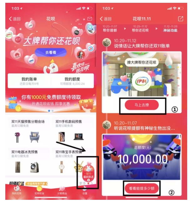 都是同一个入口:打开支付宝 - 我的 - 花呗 - 双11福利放送。