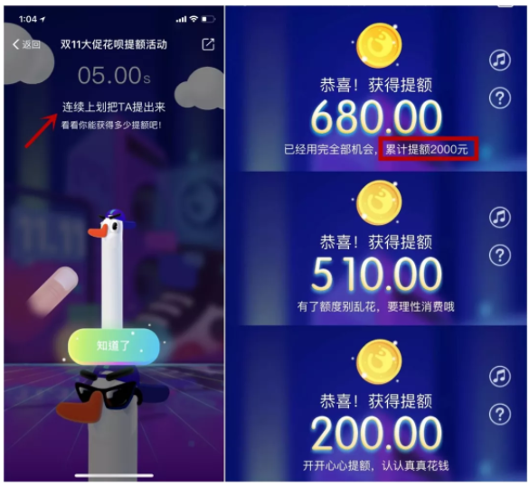 几秒后游戏结束,会告诉你成功提额多少钱,亦或是失败了请再来一次。