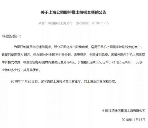 早在上个星期,中国移动上海公司就发布将推出阶梯套餐的公告。新套餐月使用费为18元,包含80分钟全国主叫分钟数、来电显示,全国被叫免费。套餐之外的国内手机上网流量采取单价模式收费,根据用户每月使用量分为4段,价格最低至0.005元/MB,也就是折合5元/GB。中国移动在公告中表示“用多少就付多少钱,越用越便宜。”