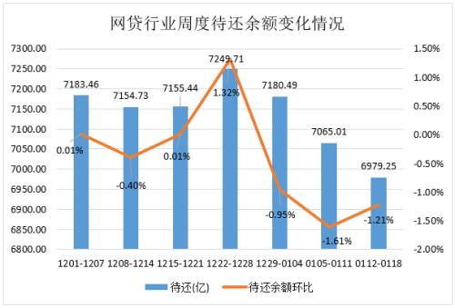 本周(1.12-1.18)网贷行业累计成交量为211.12亿元,较上周(1.5-1.11)环比上涨7.85%,待还余额为6979.25亿元,环比下降1.21%。