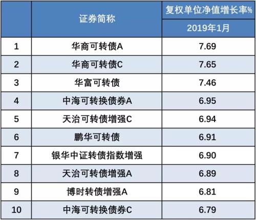 受益于股市上涨,可转债类的债基也占了不少光。1月涨幅最大的债基是华商可转债A,达到7.69%,其余前十上榜的也均为可转债类。