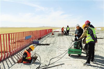5月15日,二连浩特至秦皇岛高速公路苏(苏尼特右旗)化(化德)段施工现场,30米长的水泥预制箱梁正在吊装铺设。