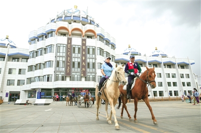 5月14日,内蒙古赛马场马术俱乐部的教练员在进行队列练习。