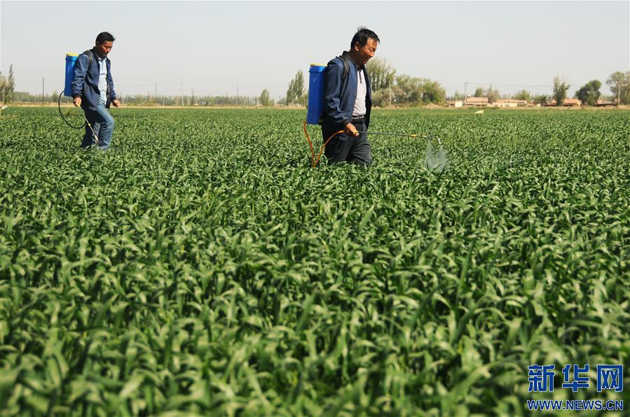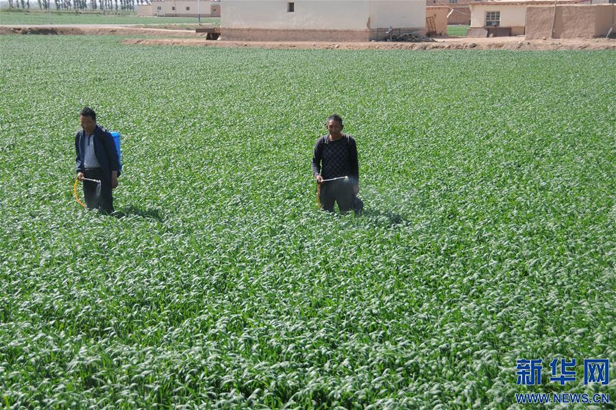5月28日,内蒙古巴彦淖尔市临河区干召庙镇棋盘村村民在麦田中喷药防治病虫害。新华社记者李云平摄