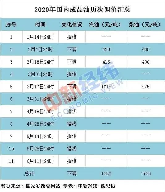 记者梳理发现,今年以来,国内成品油价格已经历11次调整,其中8次搁浅、3次下调,汽、柴油价格分别累计下调1850元/吨、1780元/吨。值得注意的是,从3月31日24时的调价窗口开始,国内成品油价格已连续6次因国际市场原油价格低于每桶40美元而搁浅。如果本次油价上调落实,2020年国内成品油调价将呈现“一涨三跌八搁浅”的格局。