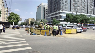 记者采访期间注意到,虽然不是交通高峰时间,但是十字路口四个方向都安排了交警现场指挥交通疏导车辆,因为施工区域占据了一部分路面,现场交警要求东西方向直行车辆全部右转绕行该路口。同时记者看到燃气公司的工作人员也在现场周边进行检查,他们告诉记者该路段地下的燃气管网比较复杂,供排水部门在使用机械挖掘地面施工期间,要特别小心避让燃气管道。