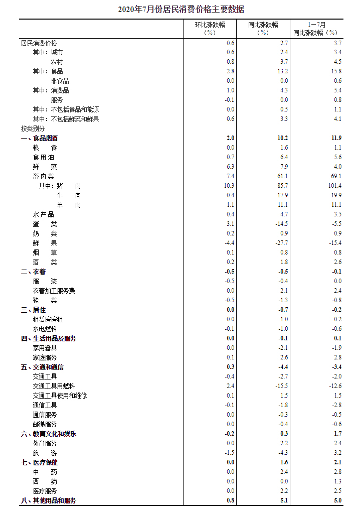 2020年7月份,全国居民消费价格同比上涨2.7%。其中,城市上涨2.4%,农村上涨3.7%;食品价格上涨13.2%,非食品价格持平;消费品价格上涨4.3%,服务价格持平。1—7月,全国居民消费价格比去年同期上涨3.7%。