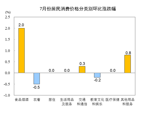 7月份,全国居民消费价格环比上涨0.6%。其中,城市上涨0.6%,农村上涨0.8%;食品价格上涨2.8%,非食品价格持平;消费品价格上涨1.0%,服务价格下降0.1%。
