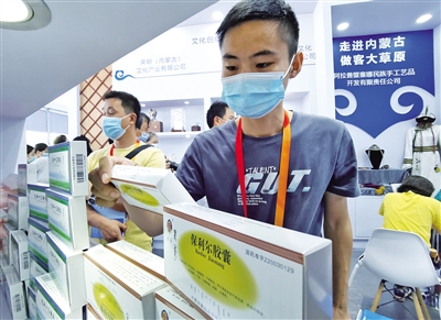 交易会上,我区文化旅游、电子商务、蒙医蒙药等领域的相关企业纷纷亮相。内蒙古参展商马苏乳业负责人介绍道:“策格疗法是自治区非物质文化遗产,首都的多家疗养院都在和我们洽谈,很快我们的产品会走进北京市场。”