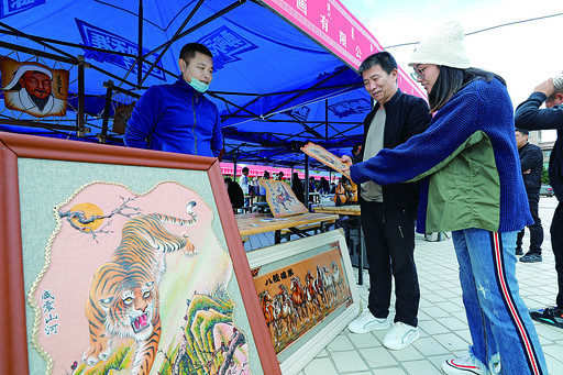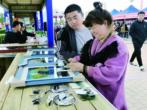 顾客在工艺产品摊位上欣赏皮画