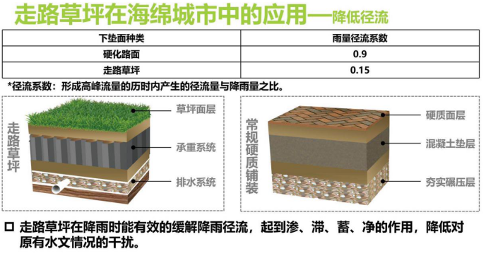 停车场草坪最大的优点是对建造地无性质要求,可缓解建设用地与绿化用地的矛盾;还可以增大雨水下渗,对打造“海绵城市”、解决城市内涝有积极意义。