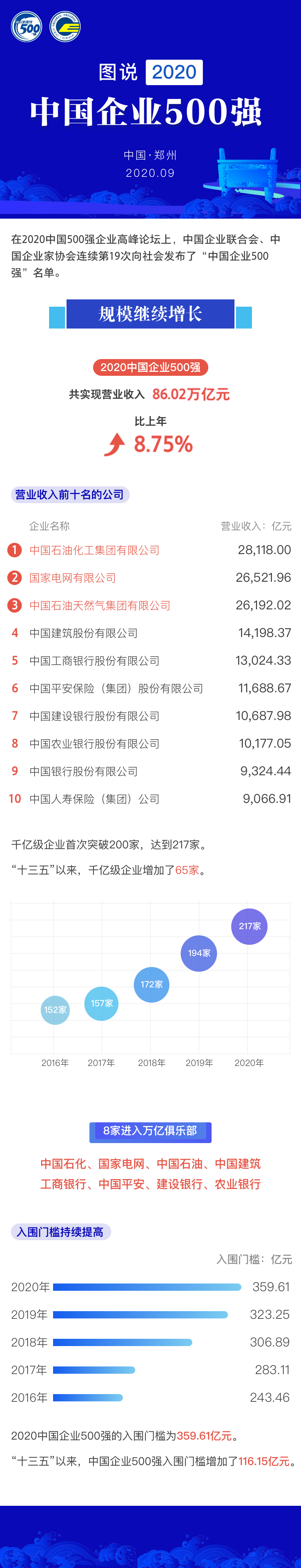 千亿俱乐部加快扩容,2020中国企业500强中,营业收入超过1000亿元的企业数量增至217家,净增23家;有8家企业营业收入超过1万亿元,分别是中国石化、中国石油、国家电网、中国建筑、中国工商银行、中国平安、中国建设银行、中国农业银行。