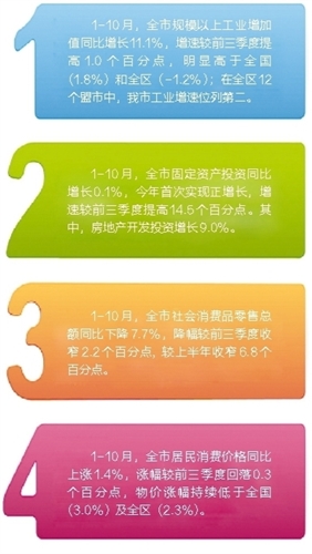 三大门类全面发展,近六成行业正向增长。从三大门类来看,1-10月采矿业增加值同比增长22.2%,制造业增长9.1%,电力、热力、燃气及水的生产和供应业增长9.7%。从全市31个大类行业看,有18个行业增加值实现正增长,行业增长面为58.1%,比前三季度扩大16.2个百分点。