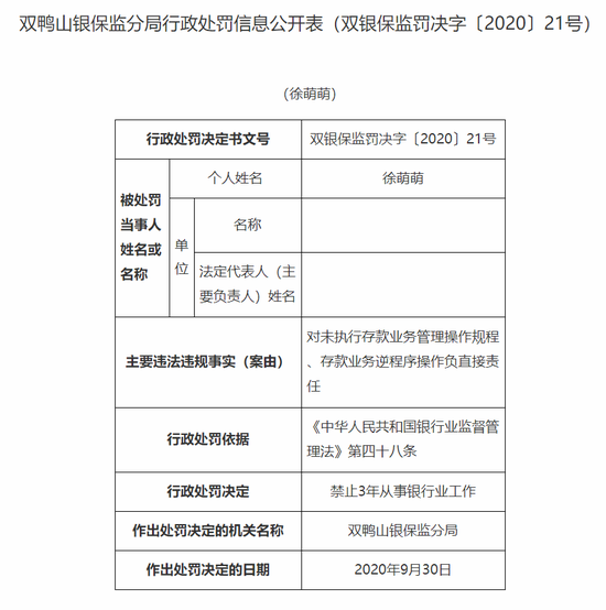 同时,相关责任人牛微对违规授权造成银行资金短款、私盖印章诈骗客户资金负直接责任,被禁止终身从事银行业工作;徐萌萌对未执行存款业务管理操作规程、存款业务逆程序操作负直接责任,被禁止3年从事银行业工作;孙成宇对龙江银行双鸭山分行未建立案防工作相关制度、案防制度落实不到位、发生诈骗客户资金案件负领导责任,受到警告处分并被罚款10万元;陈永新对龙江银行双鸭山分行员工行为排查流于形式、印章管理不到位、强制休假制度执行不到位负管理责任,受到警告处分并被罚款5万元;付贵臣对龙江银行双鸭山分行案防制度落实不到位、印章管理不到位、发生侵占银行资金和诈骗客户资金案件负管理责任,受到警告处分并被罚款5万元。